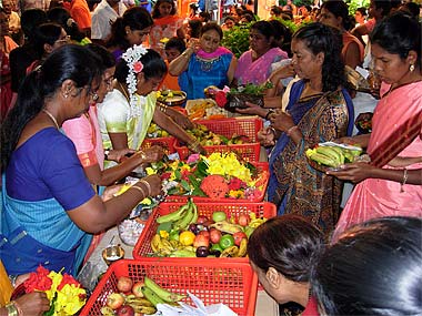 Lady helpers taking care of the offerings far off the steps...