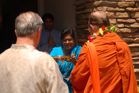A coconut camphor arati greets Bodhinatha at the door of Pramlin Naidu's home.