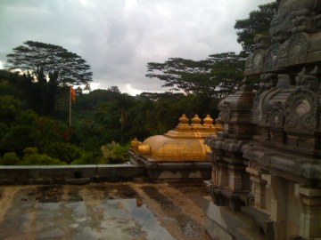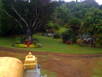 From the roof you see Dakshinamurthi under the banyan tree and the Lotus Pond to the right behind the palms.