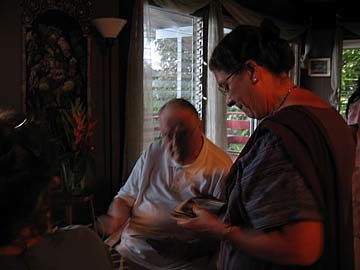 Before the silpis arrived, Wailua Mission members look at photos from Tandu and Uma Sivanathan's recent trip to Japan.