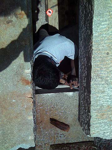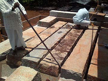 The silpis then began the assembly of the stones. One team stands above, using the steel bars to move the stones into place.