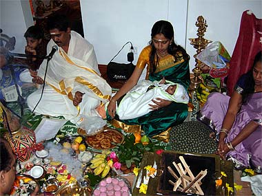 Writing the name of the baby girl on a tray of unbroken rice is an important part of the ceremony...