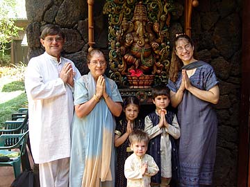 On the left are Aran and Valli Sendan. Center is Shaila, Vasuki Sendan's daughter. On the right is Mira Sendan with her two sons, Chidambaram, and little Adiyan who received a special archana in celebration of his second birthday.