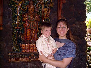 Adiyan and Mira, mother and son, in front of Lord Muruga. Adiyan is proudly wearing a silver pendant of Lord Muruga from Tiruchendur gifted to him by his grandmother, Valli Sendan, in honor of this special occasion.