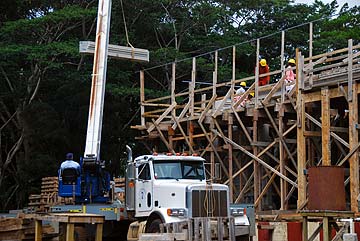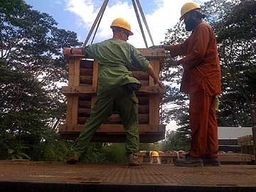Down on the ground the crew takes the opportunity to use the crane to move crates that were offloaded from containers on the Nandi mandapam area.