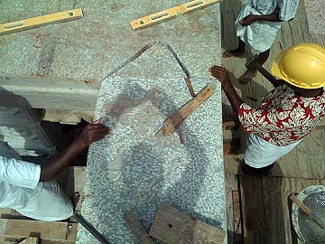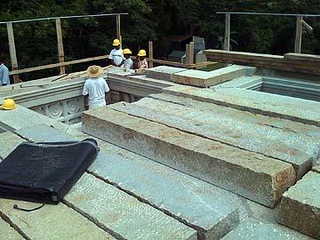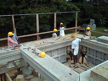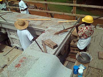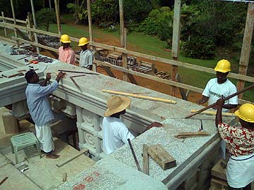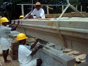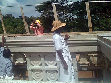 Your TAKA writer today took a break from his desk and climbed up to the top. The silpis were discussing the intricacies of jointing the newly place beam. Other roof stones are sitting on top of the roof stones already placed. They will move into their stations later