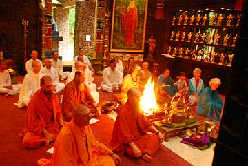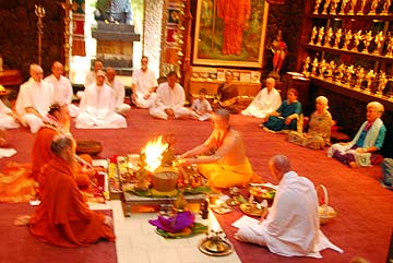 Sun One begins a new phase with Bodhinatha looking bright during his weekly upadesha after the homa. He spoke this morning on Gurudeva's teaching that one must become simple, direct and uncomplicated in order to experience Parasivam. It is the intellect that makes things complicated. "Concepts are not the goal," he explained, "we must transcend the intellect to experience God."