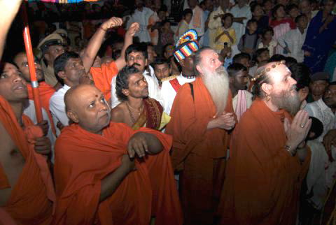 On February 16th Bodhinatha was invited to be present for the inauguration of a great, new Siva temple being opened in Karnataka state. The inspiration behind the temple is none other than our own Sri Sri Balagangadharanathaswami, who has been so instrumental in the building of Iraivan over the years. This photo is taken at a high point in the consecration ceremonies.