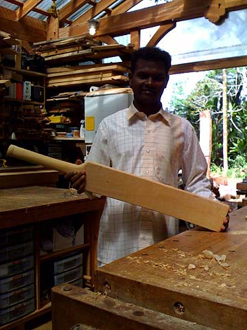 As a side project, Kumarswami made a cricket bat for the silpis. Cricket is one of their favorite sports. Tourists and local marvel at their games at the beach on their outings. Here Manickandan is holding the finished project, made from cyprus wood.