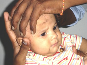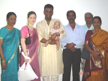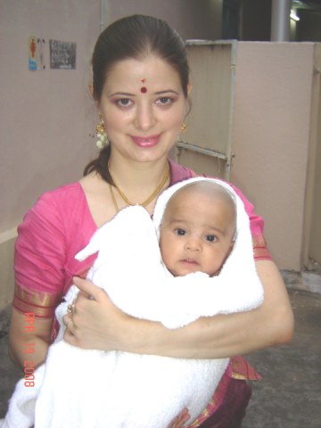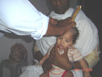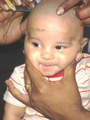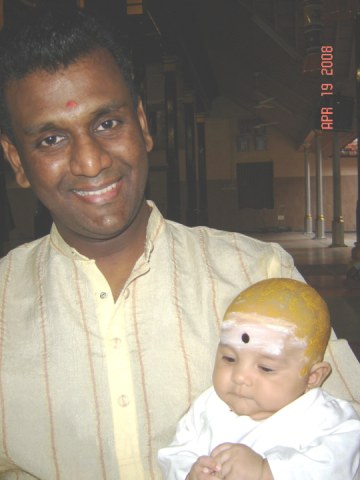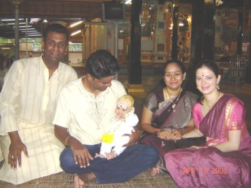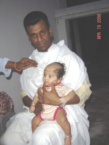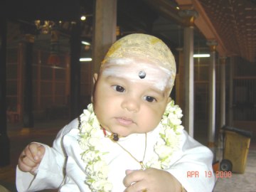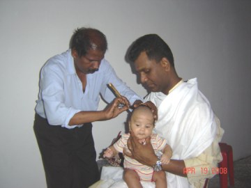 These are some pictures from our son, Arunesh Eswaran's Chudakarana Samskara when he was 3 months old in conjunction with the Chitra Purnima celebration in Malaysia. It was done at 6.30am on Saturday, April 19, 2008 in the Nattukottai Chettiar Sri Dandayuthapani Temple, Waterfall Road, Penang, Malaysia. The traditional Indian barber came to the temple and did the shaving in a room at the back of the temple. He used the traditional knife and did a perfect job--without even a single cut. Arunesh was calm and quiet throughout. After the head shaving he was given a bath in the temple itself and was dressed in new white clothes ready for the temple puja and an elaborate archana offering for Lord Muruga. Finally, a variety of prasadam was given to all who were in the temple.