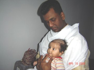 Arunesh sits on his maternal uncle, Punitharaja Nadaraja's lap, awaiting for the temple puja to start.