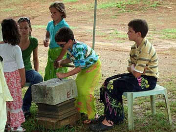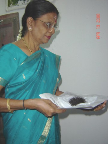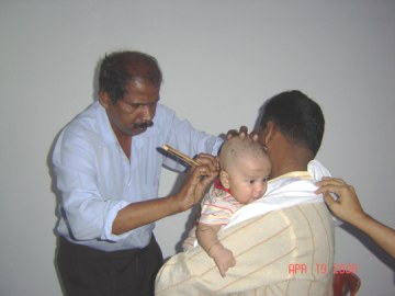 Arunesh's grandmother, Thana Lakshimi Kuppusamy, collects Arunesh's birth hair as the barber removes it, one lock at a time. We will later offer it into a river next to the temple.