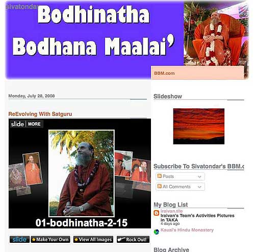 I've updated with a slick slide show and made the blogspot more animated and lively. Slowly with other team members (especially Madhu), we're moving to make this blogspot as lively and as interesting to read and get them come forward to know more about SSC, teachings, Guru Parampara and Iraivan