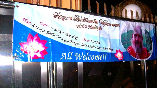 Our preparation activities to receive Satguru at Arulmigu Sithivinayager temple, Taman Johor Jaya, Johor Bahru on 25th August 2008 is going on smoothly and we had placed welcoming banner ( see attached pictures) at entrance of temple in Tamil and English.