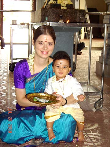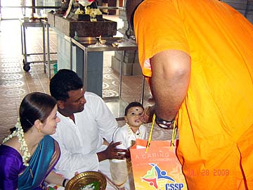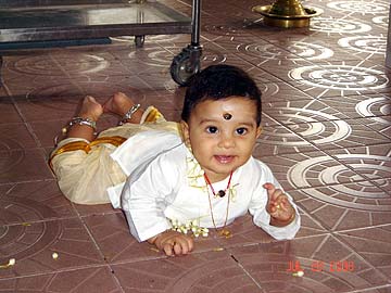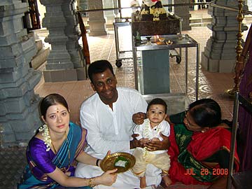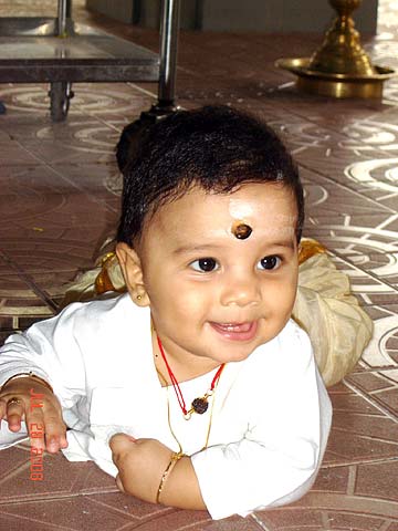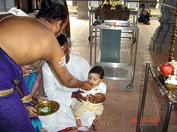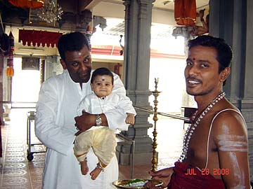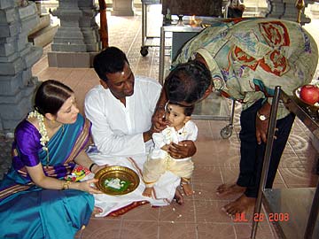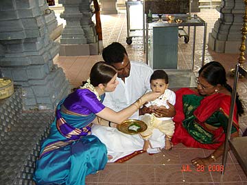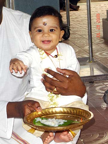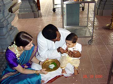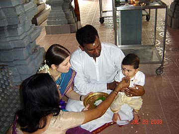 We did the Annaprasana, or first feeding for our son, Arunesh Eswaran on July 28, 2008 at 10:30 am in the Penang Nagaratthar Sivan Temple. He was 6 months old and showing every sign that he was ready to start eating solid food. The priests did an elaborate archana for Arunesh and offered "paal saadam," a kind of sweet rice cooked with fresh milk. After the archana was complete, we sat before the diety with Arunesh on his father's lap, and the priest gave us a bit of the rice prasadam on a betal leaf. We then each fed Arunesh a taste of the prasadam, which he seemed to really enjoy.
