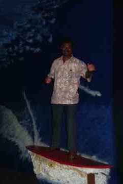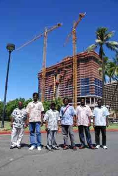 Our Indian craftsmen take a day off: in Honolulu! These six master sculptors have been working month after month on Kauai. But they had never seen a real American city, never seen an 8-lane highway, never seen Waikiki or a battleship.