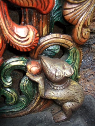 At His feet is the humble Mushika, making an offering.