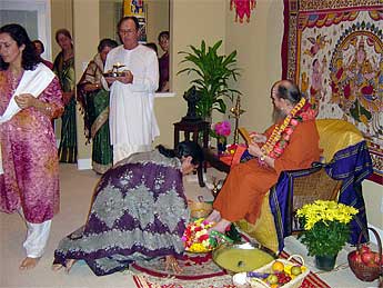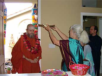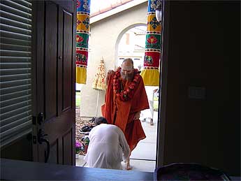 Vijaya Sankara washing Bodhinatha's feet before he enters their home.