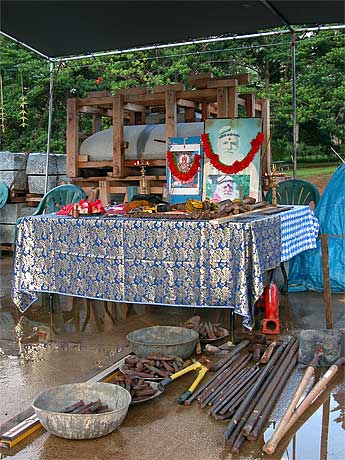 The silpis have the altar set up to Goddess Sarasvati and Gurudeva... and all their tools