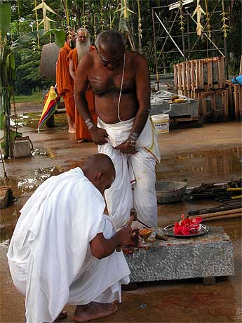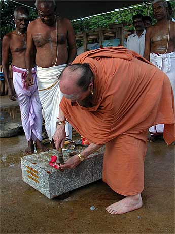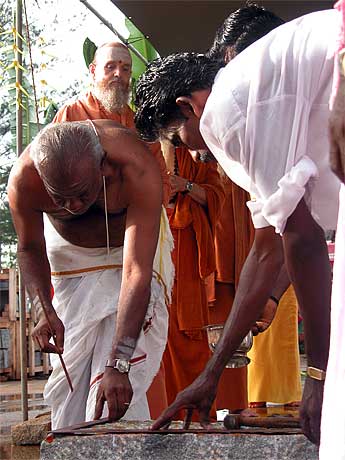 pping of the stone by everyone present... Sthapati draws the line for the carving...