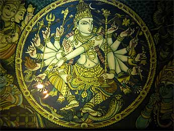 This magnificent painting by A. Manivel, of Pradosha Siva, was enlarged and now hangs in Kadavul Temple.