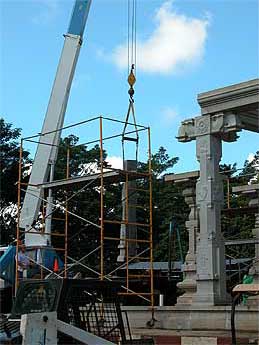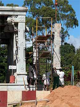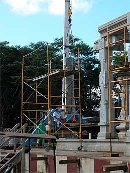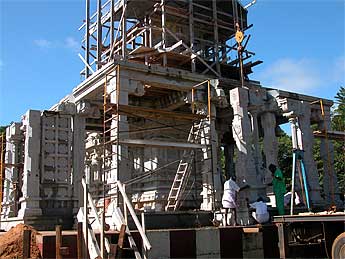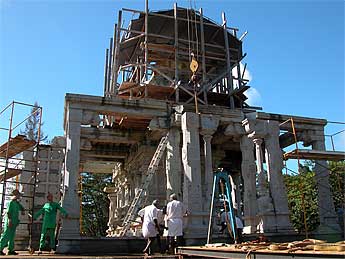 The temple took a big leap forward today with the raising up of more pillars. It was as if the devas planned for it. After weeks of rainy days, the sun came out today. Perfect cool clear weather for our team.