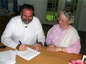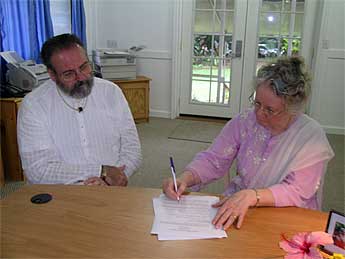 Kulapati Shyamadeva Dandapani and Kulamata Peshanidevi sign papers to initiate a new fund in the Hindu Heritage Endowment.
