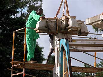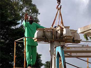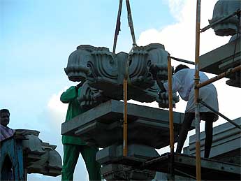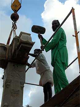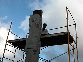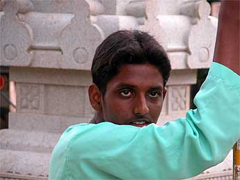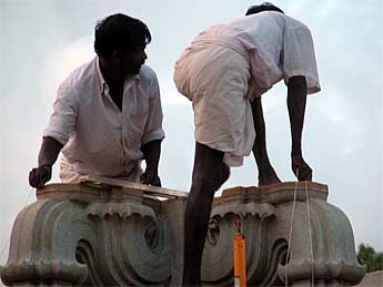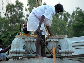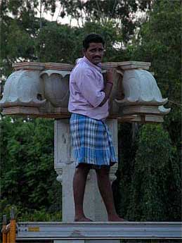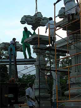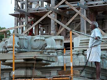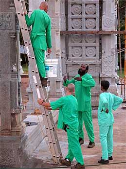 Potriyan Sivanathan from Malaysia has come on task force for a month. We have known him since he was still a baby in his mother's arms. Today he's a full grown intelligent 15-year old and is really proving to be a great help. In the mornings he has been serving in the Ganapati Kulam this phase and he helps the Siddhidata Kulam in the afternoon. Today he assists with the raising of stones...