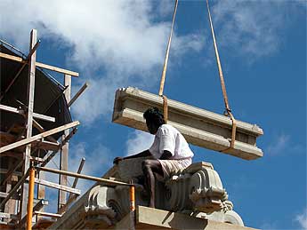 The work moves steadily but slowly. These huge beams need to be perfectly in place and now, with the help of the crane, is the time for adjustments.