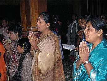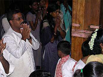 After the arathi devotees rushed lovingly forward to pass their hands over the sacred flame...and receive other pure items used during the pada puja...
