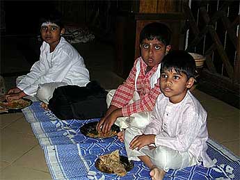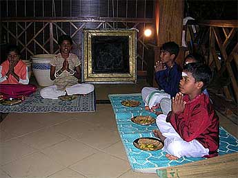 veryone sat on mats to traditionally enjoy a meal which consisted of chapatis, curries and green mango pickles. The children are chanting the food mantra before partaking the meal.
