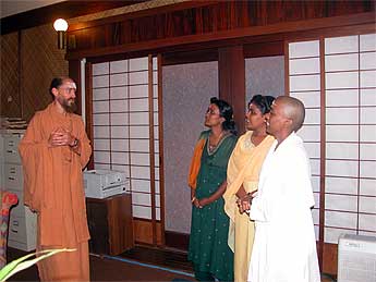 The Malaysian contingent continues the rounds of the Kulams. Sannyasin Saravananathaswami shows them the Ekadanta Kulam offices and explains what he and Sadhaka Dandapani (who is behind the camera) do in their service to God, Gods and Guru.