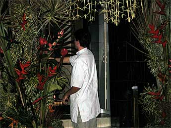 Yesterday afternoon... Tandu Sivanathanan and Jothi Sendan decorate in front of the Muruga shrine with an incredible array of tropical flowers and plants harvest from the Aadheenam grounds.