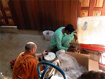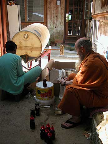 Sannyasin Muruganathaswami assisted by Potriyan are filling up Honey Bears
