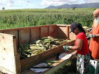 On the Himalayan Acres land across the from the temple we have had our third major corn harvest today with help from Marcheta (seen here), her husband Augusto and son John, hired for the job. They wanted some extra money to send John to the Rose Bowl this New Years as part of Kauai's excellent all-island marching band. The corn had suffered mightily from the torrential rains of last month, with the harvest below what was expected.