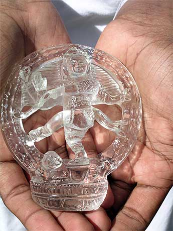 "The quartz crystal dancing Ganesha was found by Nellaiappan. Most crystal Ganeshas are in a sitting form because it is easier to carve (not as many delicate parts as in a dancing Ganesha). I'm told that most crystal is quarried in South India, then shipped to North India where it is carved. Then it is shipped back to South India for sale."