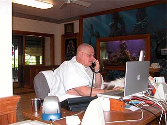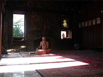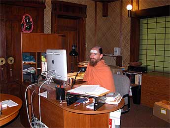 Sannyasin Saravananathaswami in the "EK" as we call it... the Ekadanta Kulam... taking care of communications with the sishya around the world, coordinating ground arrangements at distant locations way in advance of Bodhinatha's travels, working out details for festival schedules, himself doing many pujas in the temple, and on his days off, working hard outside raising flowers for the temple... and more....