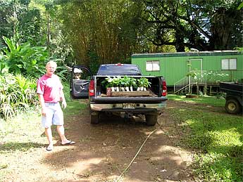Meanwhile the Aadheenam's plant and agricultural side is moving along in a dynamic way. Sadhaka Adinatha has been taking the lead in tree planting initiative on the Himalayan Acres land across the way. As one way to support the cost of those plantings, he acquired some teak tree seeds and raised the seedlings up and sold them to another tree farmer. The seedlings were ready today and went off to their new home.