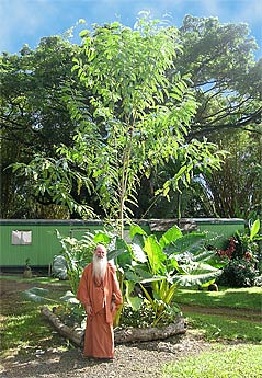 "This is a new tree in the temple grounds, called Sesbania grandiflora or the "Hummingbird Tree," since the birds feed from the large flowers. This tree was lovingly planted by Yogi Japendranatha's family during their visit this spring. When they all joined together to put it in the ground, it was less than four feet tall. Now, just a few months later, it's 20 feet tall. It's flowering for the first time."