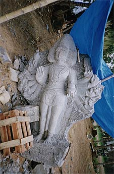 We recently asked for a photo of the work in progress in Mahabalipuram on our newest masterpiece for Kauai Aadheenam, the 7-foot Arumugam that will grace the entrance under the ancient and truly giant banyan tree on the left as the path approaches Kadavul Temple. It is proceeding swiftly at this point, and Tiru Nellaiappan informs us that it may be completed in January and ready to ship to Kauai.