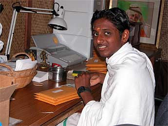 Potriyan at work in the Ekadanta kulam office on a Kauai Aloha Endowment mailing to all donors. He and his mother have extended their stay for another week.