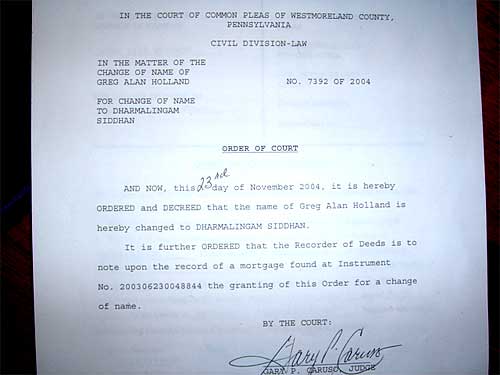 Greg Holland has been studying with Gurudeva and then Bodhinatha for several years and making great progress. He recently made his new Hindu name "Dharmalingam Siddhan" legal. Here are the court documents.