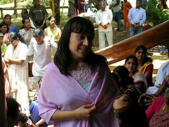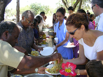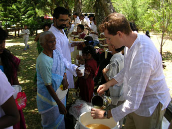 Serving food is no hectic work after the ceremony. Everyone voluntarily joins in to help. Our Amma is nicely being served orange juice by a foreign visitor...