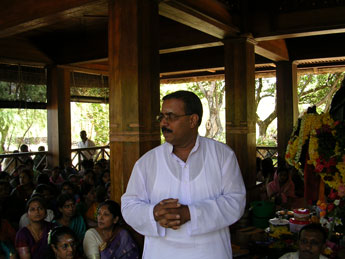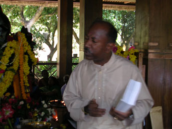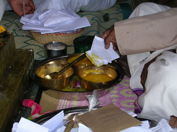 Kulapati Siven Koothan is dipping written prayers in ghee before offering them to the devas or angelic beings through the sacred fire. The Mandapam is already packed to capacity and devotees are seated on the front steps and on the wing of the Mandapam.