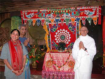 Gokul and Priyanka continue their pilgrimage here at our Aadheenam and today we shared with them about the Pancha Ganapati festival. Here they are with Sadhaka Jothinatha next to the wonderfully decorated shrine with its jade Pancha Ganapati.