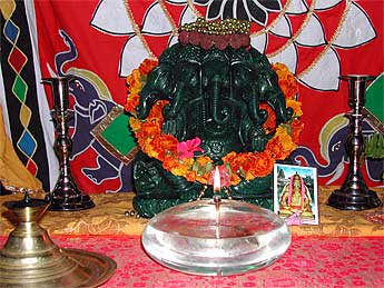 The second puja is at 9AM, and the third at 12 noon. The fourth puja is held at 3PM. At 6PM the fifth and final puja of the day is held. These five pujas to Pancha Ganapati solicit help from His devas in the home and establish the patterns for improvement in family life. The overflowing love that is felt today will inspire generosity in the year to come, bringing in return abundance and good fortune. All gifts received during the day are placed unopened before Pancha Ganapati.