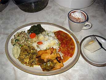 The meal was tops: Pumpkin soup to start served with papadams, followed by biryani, with tomato kulumbo, banana flower curry, fried chilies, coriander chutney, coconut chutney, cabbage pachati, closing with swiss mocha cappuccino with vanilla almond cake.