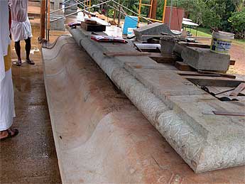 Here we see they are working on the top of one of the side gopurams we call a "Chinna Gopuram" -- the "Little" gopurams. But they are not small at all! All the fitting is being done at ground level first, as there is no option for moving and fitting the stones up in the air after the are placed later one.