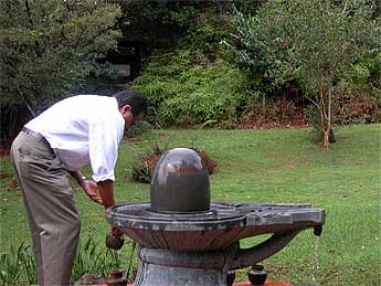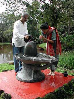 Outdoor personal abhishekam of the Narmada Lingam is always a special moment for our pilgrims.