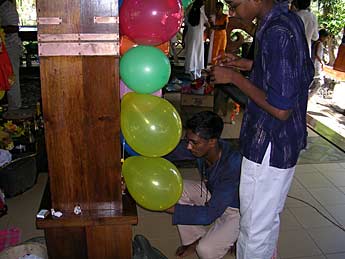 Many youth and students joined the members at Ganesha Mandapam in the morning for decorations, helping to inflate colorful balloons which were being hung on the wooden pillars... Lord Pancha Mukha Ganapati was superbly dressed in red, the shakti color of that day.